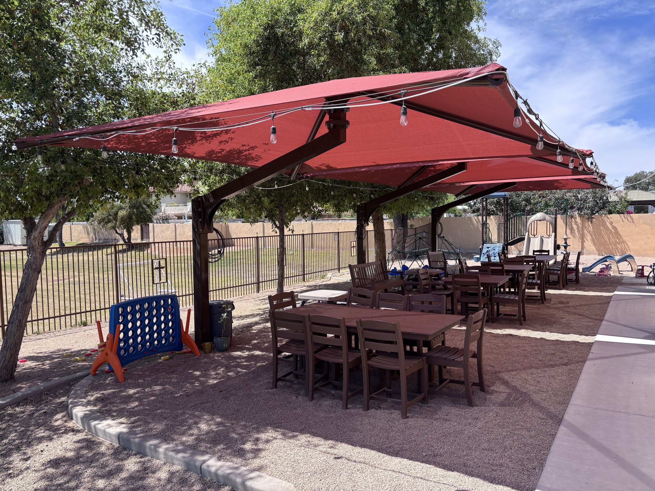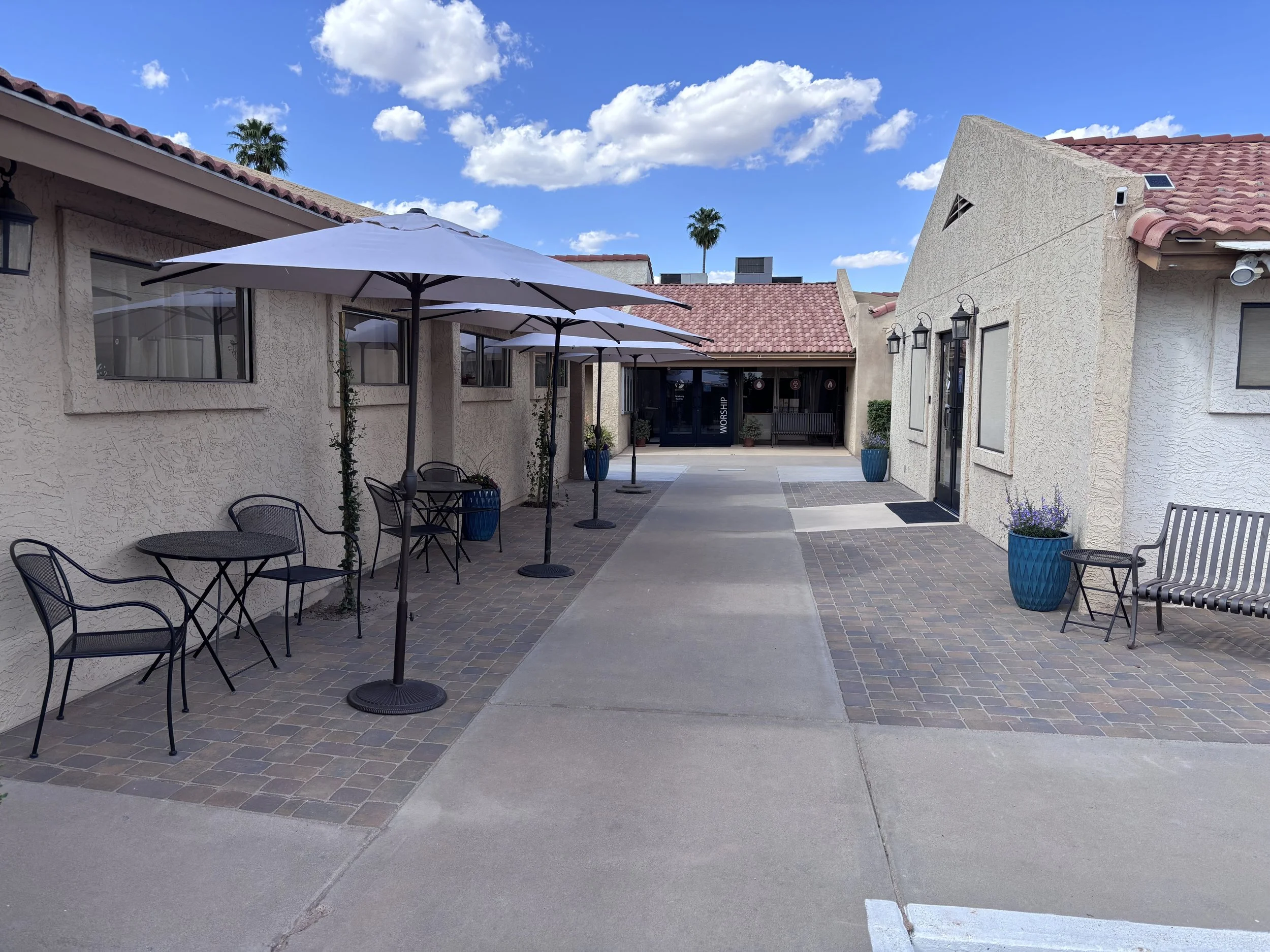 outside on our patios or in the fellowship hall